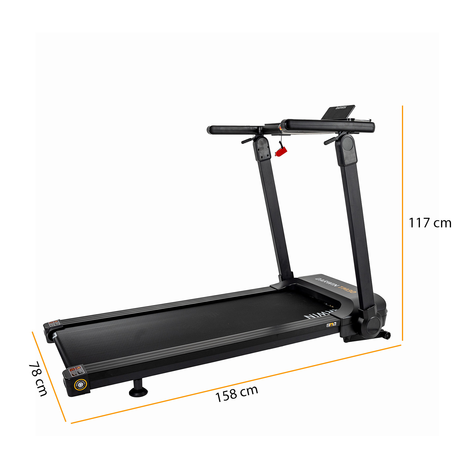 Folded - Darwin Treadmill TM30: (L) 158 cm x (W) 78 cm x (H) 22 cm - Technical information:
